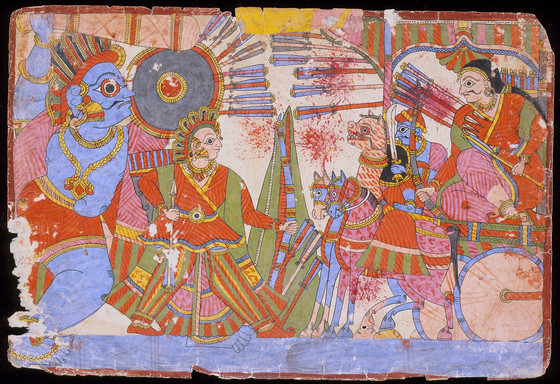 Vrishaketu and Bhima Fighting Yavanatha, Scene from the Story of Babhruvahana, Folio from a Mahabharata ([War of the] Great Bharatas)