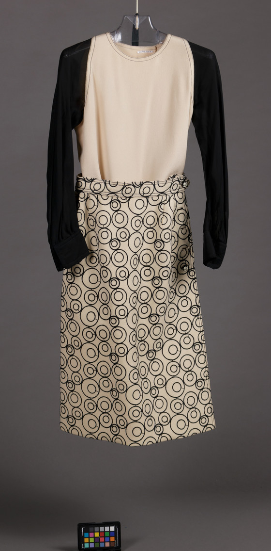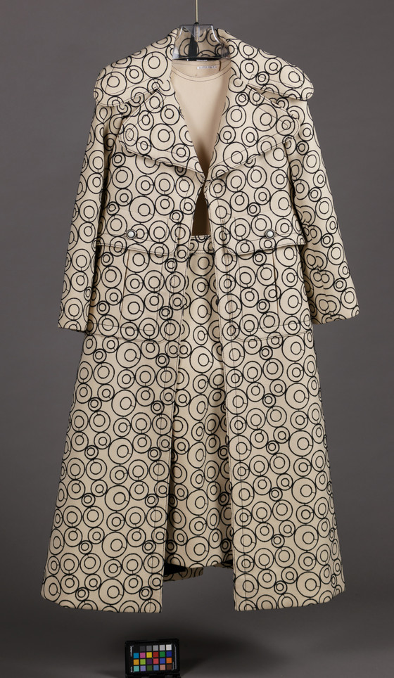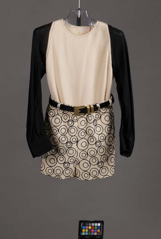Coat, Skirt, and Hot Pants: Wool plain weave with wool thread machine embroidery; Blouse: Silk plain weave (crepe), silk plain weave (chiffon); Belt: Patent Leather, metal