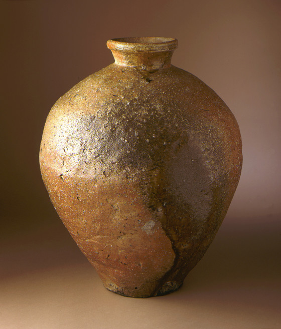 Shigaraki ware; stoneware with natural brown and yellow glaze