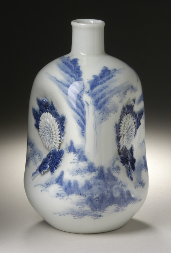 Alternate Title: 平戸三河内焼染付貼付山水文菊刻徳利