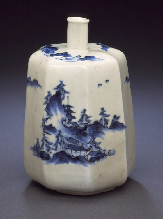 Octagonal Sake Bottle with Multi-storied Buildings in a Chinese Landscape