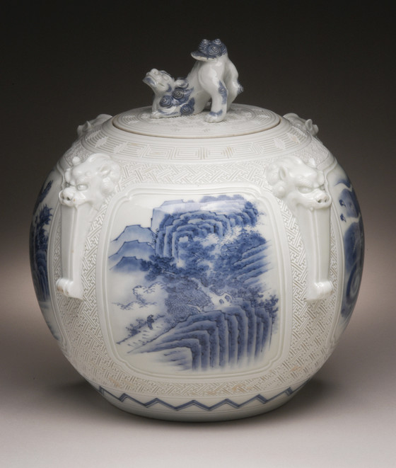 Alternate Title: 平戸三河内染付獅子耳獅子刻龍獅子山水文水指