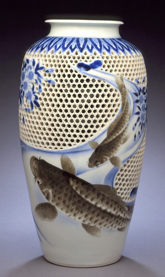 Alternate Title: 平戸三河内焼染付桜鯉川文透彫花瓶