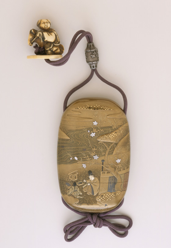 [inrō] Gold takamakie and kirigane on kinji and nashiji lacquer ground with mother-of-pearl and ivory inlays; [ojime] mixed metals (silver with gold inlays); [netsuke] ivory with staining