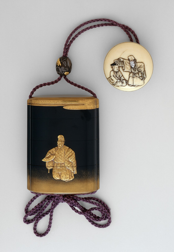 [inrō] Roiro ground and kinji lacquer with metal (gold) inlay; [ojime] mixed metals (silver and gold); [netsuke] ivory with staining