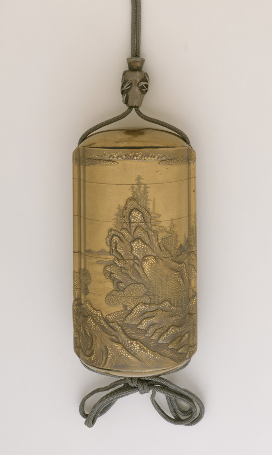 [inrō] gold takamakie, kirigane, and e-nashiji lacquer on gold fundame ground; [ojime] metal; [netsuke] ivory