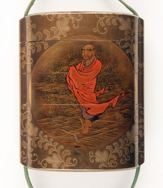 Daruma on Reed (Inrō/Ojime/Netsuke Ensemble)
