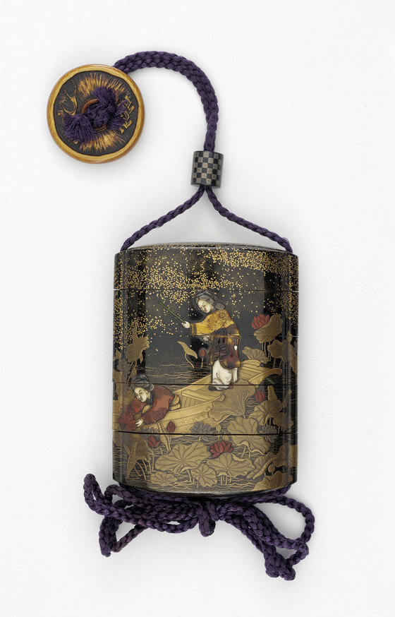 a) [inrō] Takamakie on black lacquer ground with inlays of ivory, amber, tortoiseshell, tsuishu (carved red lacquer), mother-of-pearl and metal; b) [ojime] mixed metals (shakudo, silver and mokume)