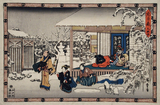 Act IX: Honzō's Suicide in Front of His Family; Yuranosuke Dressed as a Komusō Making Preparations to Attack Moronao
