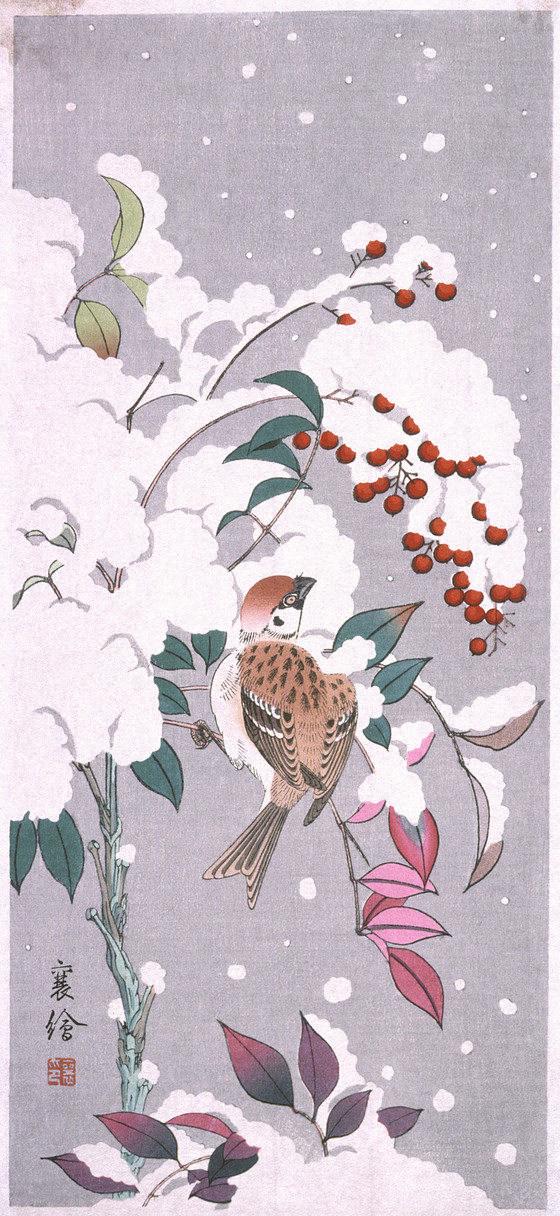 Sparrow and Nandina in Snow