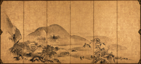 Pair of six-panel screens; ink on gold leaf