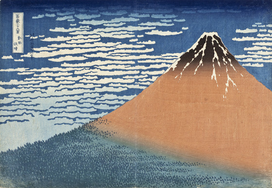 In Thirty-six Views of Mt. Fuji, Hokusai's most acclaimed series of prints, he distilled all of his compositional and narrative genius. His aim in producing the series was to show the most famous landmark in Japan in all seasons, in all possible scenic variations, and in a multitude of atmospheric conditions. He succeeded in evoking the reaction of the local inhabitants to this monumental volcanic formation. Red Fuji is the only print in the series that shows no inhabitants: it concentrates wholly on the mountain. Hokusai shows Fuji during the ominous moments before a storm blows in from the south.