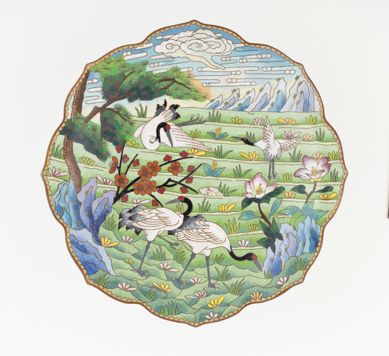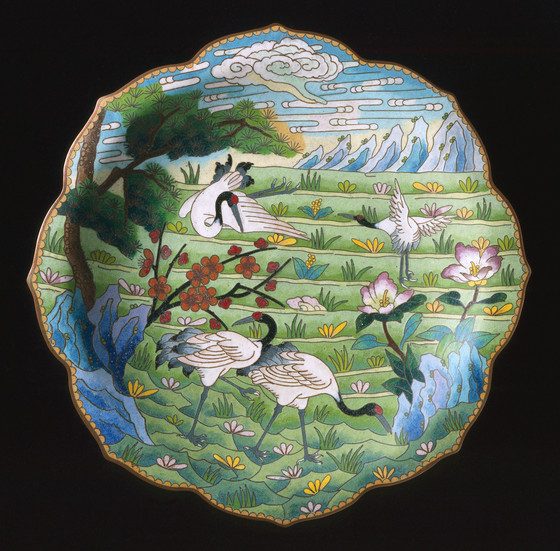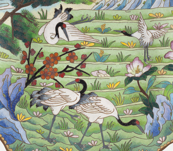 Cloisonné, design of cranes, pines, and flowers