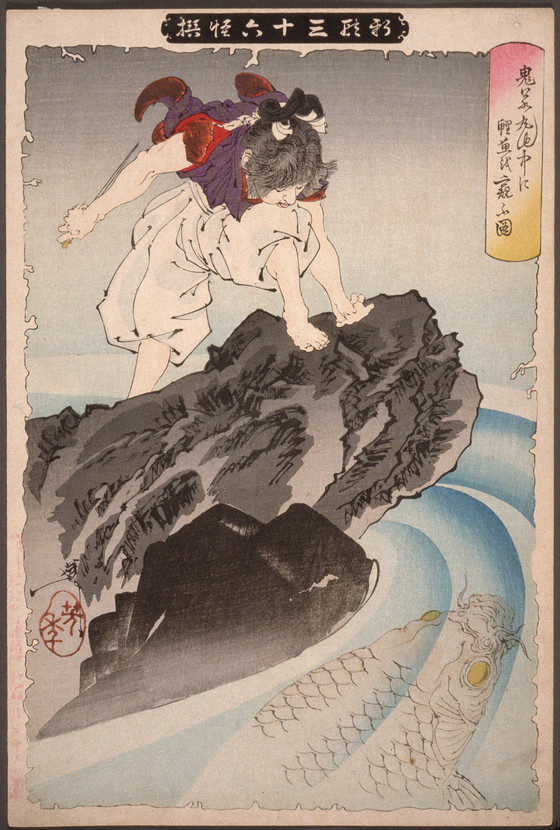 Alternate Title: 鬼若丸池中に鯉魚を窺ふ図