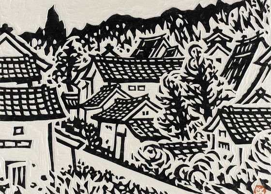Monochrome woodblock print