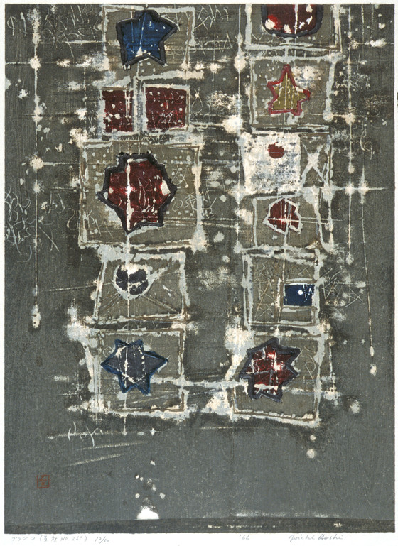 Color woodblock print from burnt plywood, turpentine-diluted ink and color on torinoko paper