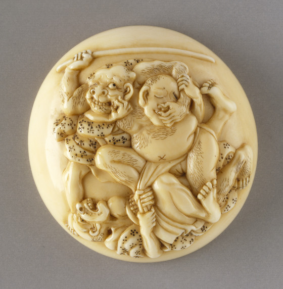 Ivory with staining, sumi, red and white pigments; manjū type