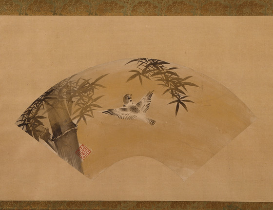 Fan mounted as hanging scroll; ink on paper with gold wash