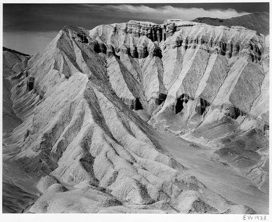 Descriptive: [at base of mountains; dark striation at top and bottom]