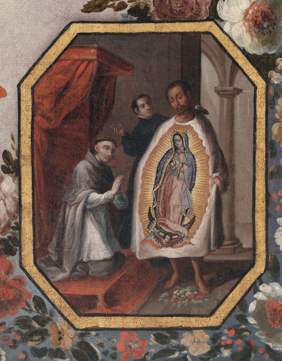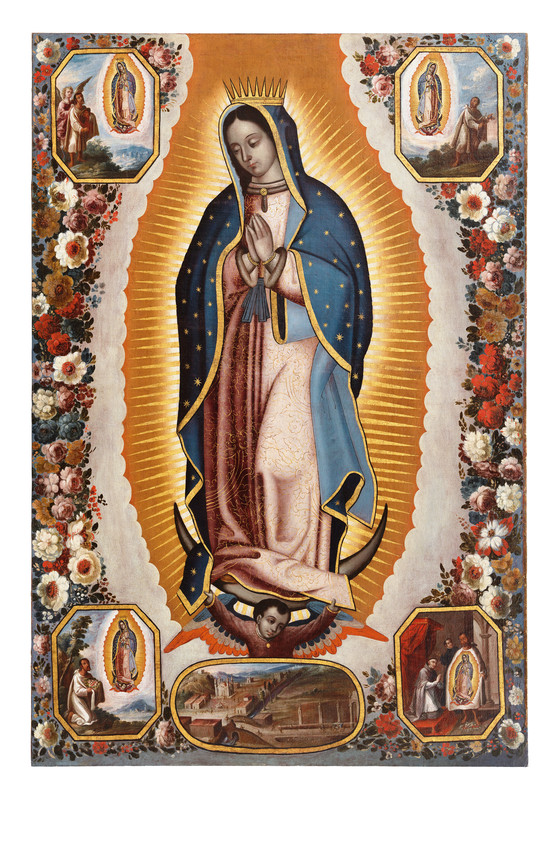 Our Lady of Guadalupe is without question one of the most revered and reproduced images of the Christian world. Legend has it that in 1531, just a few years after the conquest of Mexico, the Virgin appeared several times to the Indian Juan Diego at the hill of Tepeyac, north of Mexico City, and asked him to visit Bishop Juan de Zumárraga so he could build her a chapel on that location. At first, the bishop refused to believe Juan Diego, until he unfolded his cloak filled with extraordinary flowers, revealing the miraculously imprinted image of the Virgin. In awe, the bishop fell to his knees and begged the Virgin for forgiveness. According to tradition, the image imprinted on Juan Diego’s cloak is the same venerated today at the Basílica of Guadalupe in Mexico City, which continues to attract millions of pilgrims each year.
