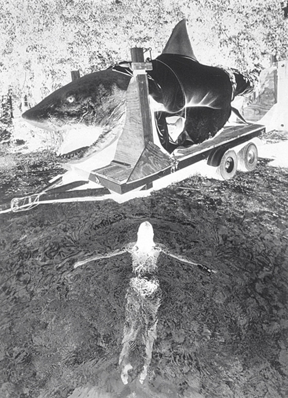 Descriptive: [Negative print of swimmer and "Jaws"]