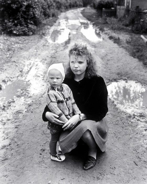 Descriptive: [mother and child in road]