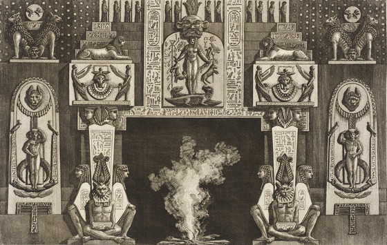 Chimneypiece in the Egyptian style: Groups of three crouching figures on each jamb.
