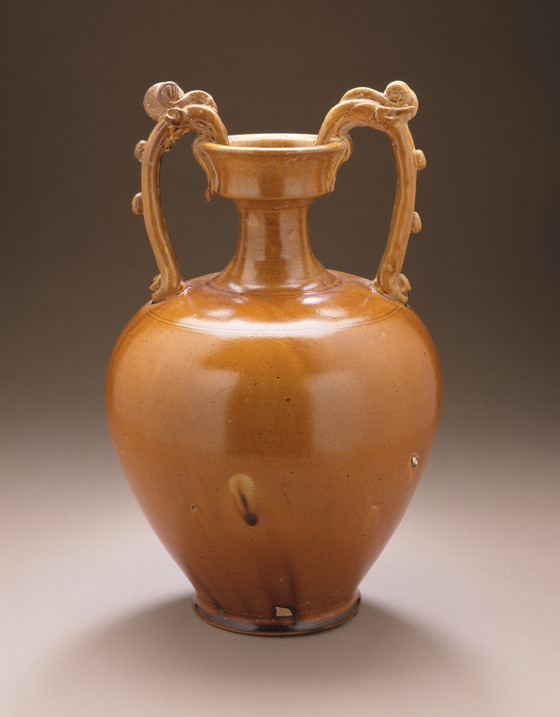 Wheel-thrown earthenware with modeled and applied decoration and amber glaze