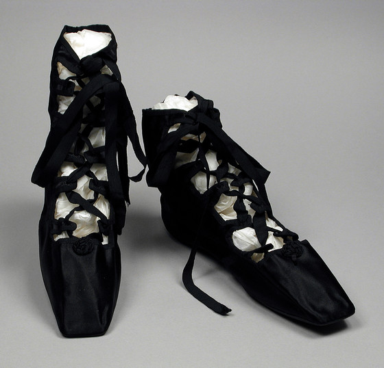 Boots: silk satin with silk grosgrain ribbon and leather; Bag: linen plain weave with mother of pearl buttons