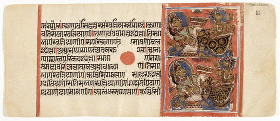 Harinegameshin Takes the Embryo of Jina Mahavira from Devananda and Brings it to Queen Trishala, Folio from a Kalpasutra (Book of Sacred Precepts)