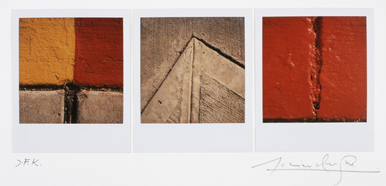 Descriptive: [Red and yellow abstract; Off-white abstract; Red abstract]
