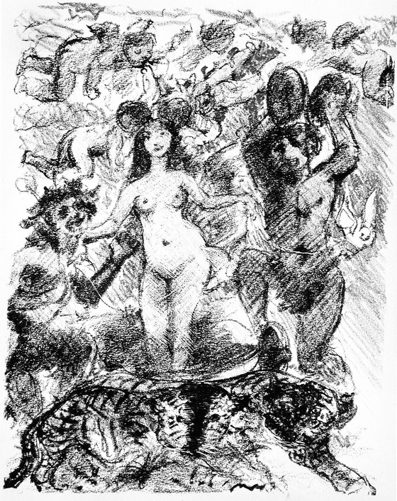 Lithograph printed in black, blue, brown, and pink on laid paper