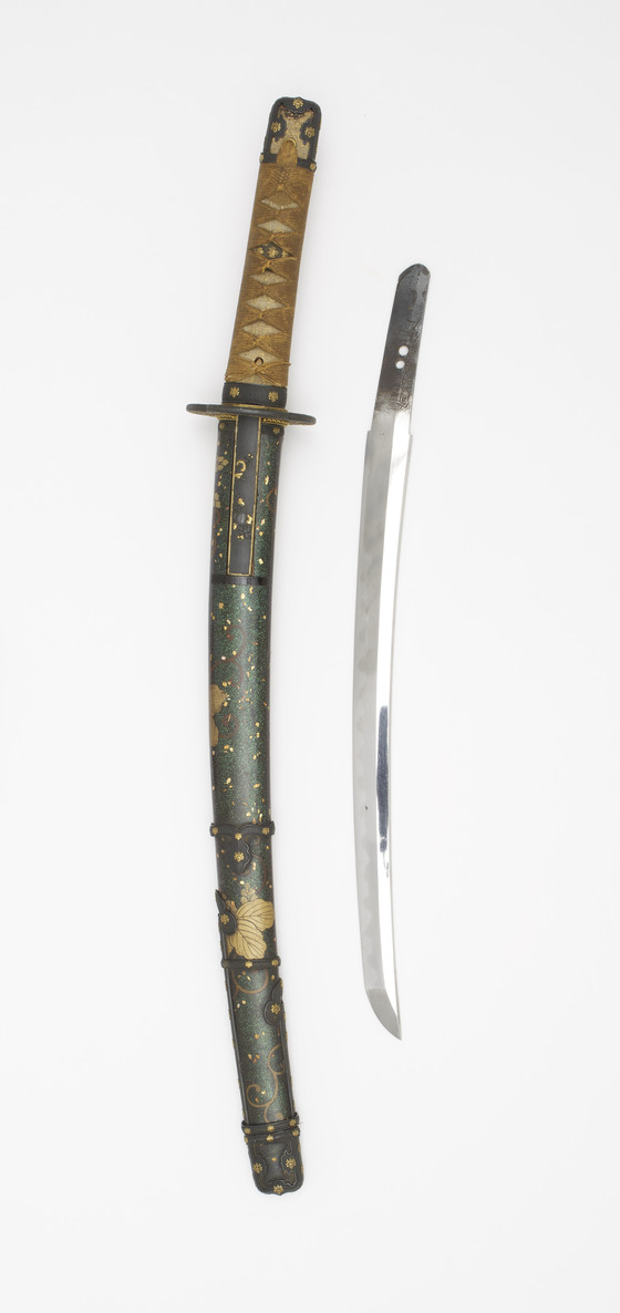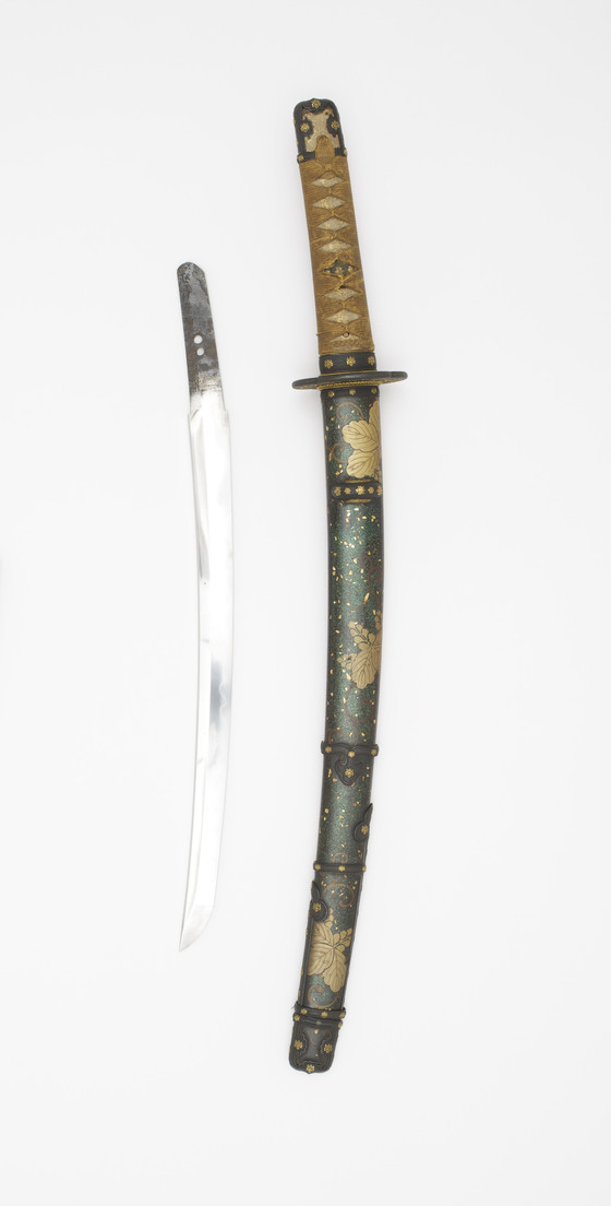 Steel, copper, gold foil, lacquer on wood, shakudo, silk