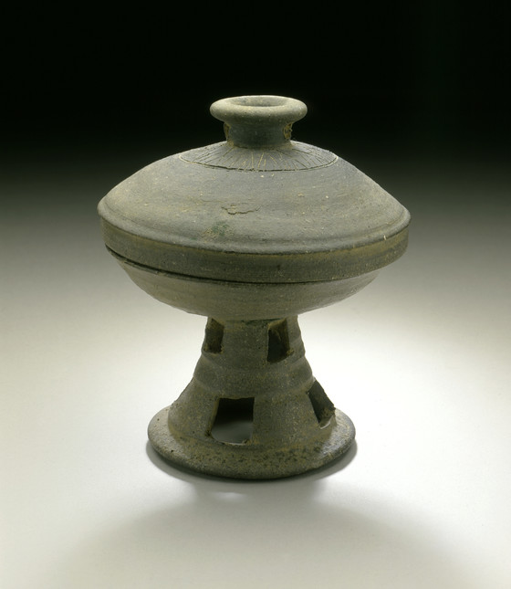 Coil-built and wheel-turned stoneware with incised and cut decoration and ash glaze