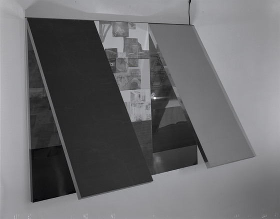 Painted fabric with photo-transfer images and highly polished colored aluminum sheet on wood substructure