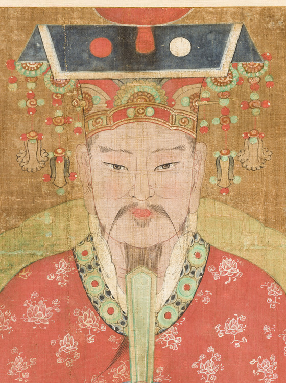 The name of the subject of this painting, Nambang Yeomje (Chinese: Nanfang Yendi), appears in the inscription in the upper right corner. Facing the viewer and wearing a red robe, he sits on a chair decorated with dragon heads. He holds a scepter in his hands, and the sun and moon appear on his crown. Except for the fact that he is shown seated, he very much resembles portrayals of the attendants[1] of Jeseokcheon (Sanskrit: Indra). Depictions of the Daoist personifications of the Big Dipper (Chilwon seonggun) also show them wearing hats that have sun-and-moon designs, and holding scepters. The LACMA panel is the only known painting of Nambang Yeomje with this iconography and with him shown as the sole subject matter of a single painting.