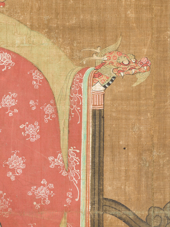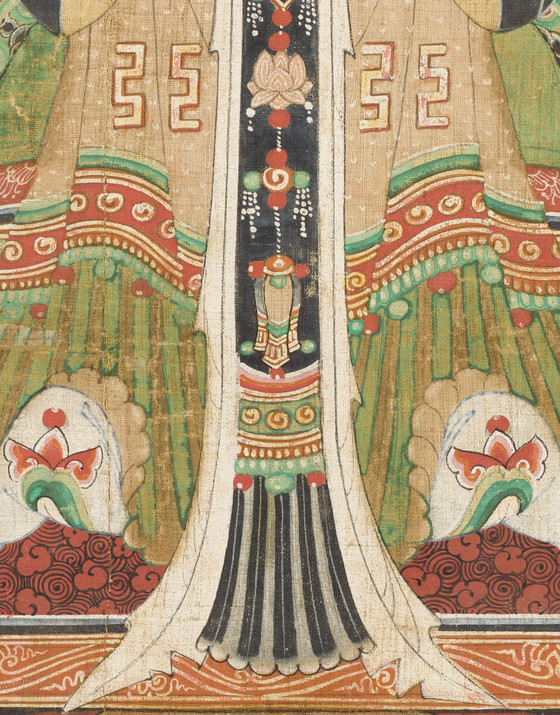 Based on the inscription and the subject matter, this painting was probably one of an original set of five. Nambang Yeomje was Lord of the Southern Quadrant; the other four paintings would have shown the lords of the north, east, and west quadrants, in addition to a central figure.[2] The five lords are differentiated only by the colors of their robes: their faces, positions, and clothing styles are the same. Intact examples of sets of these late Joseon dynasty (1800-1910) paintings exist in Gimryong Temple, South Gyeongsang province (fig. 1), and Tongdo Temple, South Gyeongsang province.