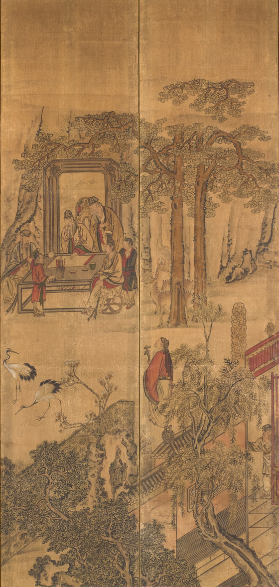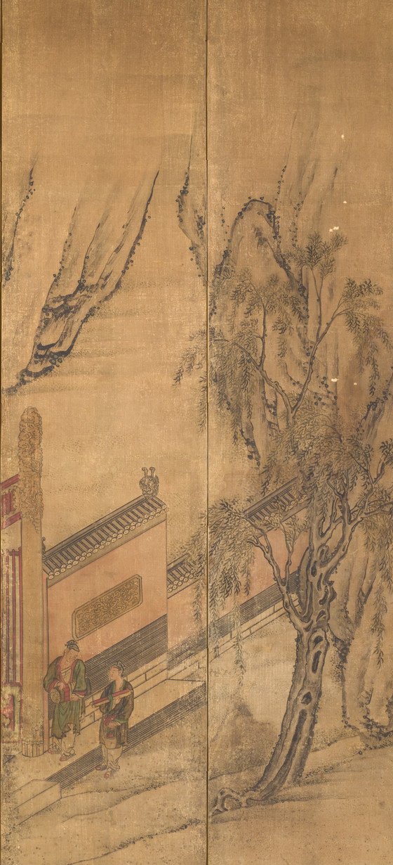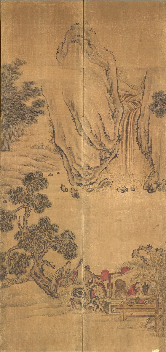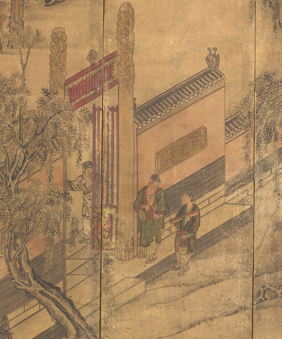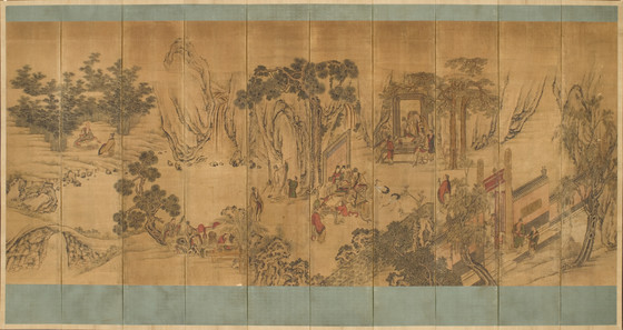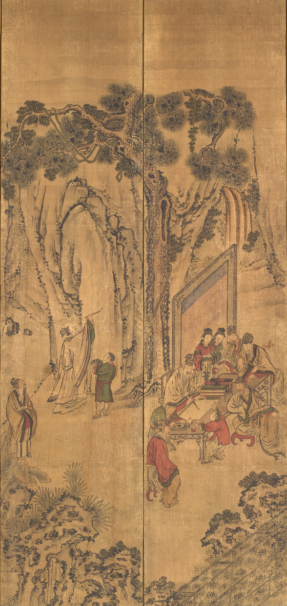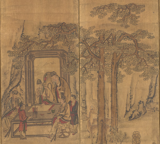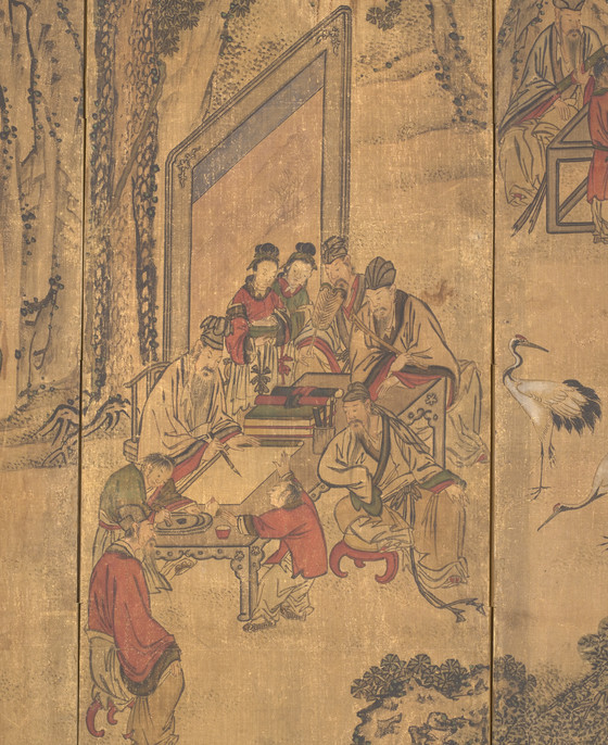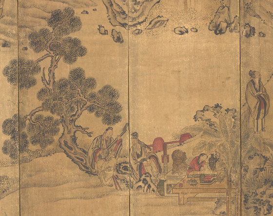 Although executed by a Korean artist, this beautifully painted large scale screen illustrates a famous gathering that took place in China during the Northern Song dynasty (960-1127). According to tradition, in 1087 sixteen famous statesmen, literati, and artists gathered in the capital Kaifeng at the Western Garden of Wang Shen (1036-after 1089), who was the son-in-law of Emperor Yingzong (reigned 1064-1067). Important guests included the poet and calligrapher Su Shi (1037-1101), the eccentric Mi Fu (1051-1107) and the famous painter Li Gonglin (1049-1106), all of whom have long been considered cultural heroes and models of scholarly virtue. Li Gonglin was believed to have recorded the gathering in a painting.[1] The subject of the “Elegant Gathering in the Western Garden” has been interpreted as an ideal or imaginary meeting that celebrates the cultural heroes of the Song dynasty, rather than as an actual event. Featuring the leading figures of poetry, calligraphy, and painting, as well as Confucians, a Daoist, and a Buddhist, the group represents the highest philosophical and artistic achievements during a period perceived as a high point in Chinese civilization.[2] Over the centuries, this legendary gathering became a frequent theme in Chinese painting.