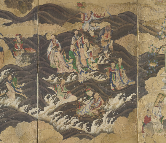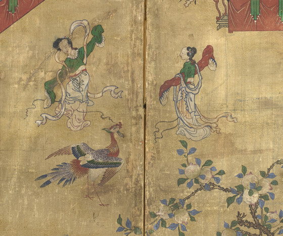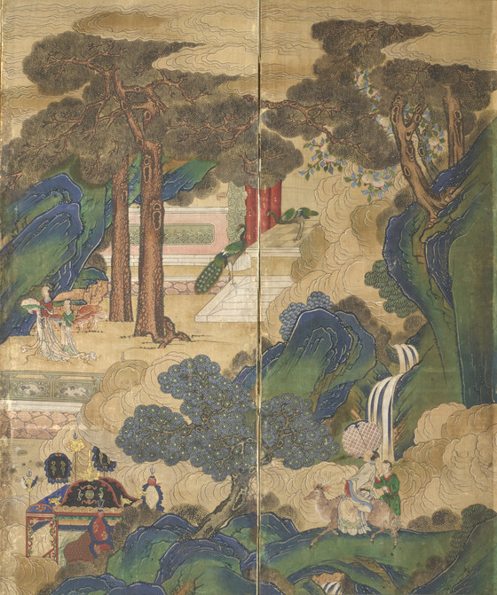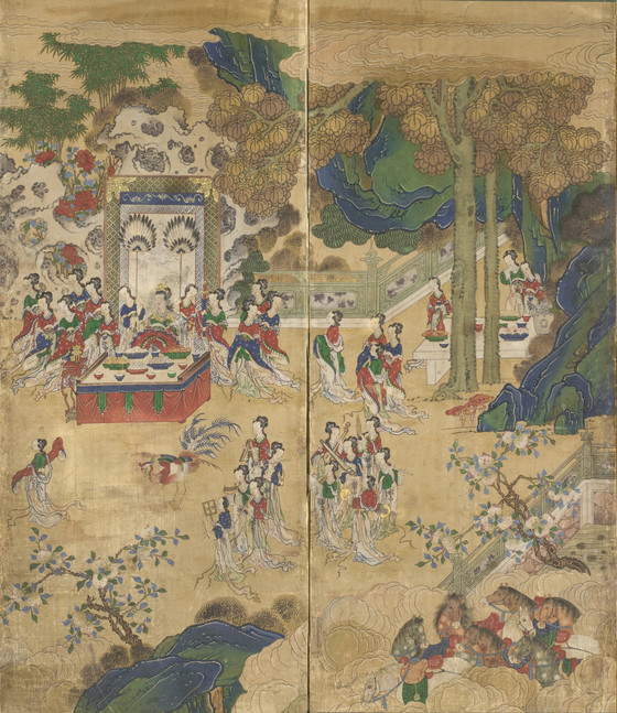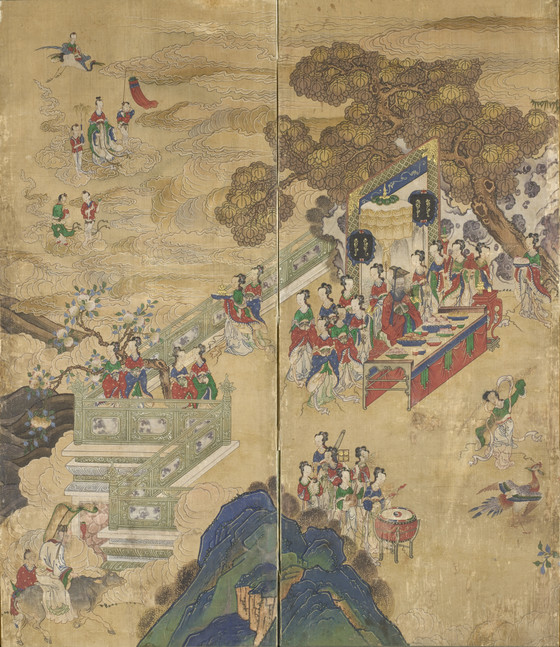 This eight-panel screen illustrates in brilliant color the legendary banquet that Xiwangmu held for the immortals around the Jasper Lake, known as yojiyeon in Korea. Because Korean scholars and artists frequently looked to China for inspiration, many Daoist subjects naturally came to appear in Korean painting. In the Daoist tradition, the Queen Mother of the West, Seowangmo (Chinese: Xiwangmu), was believed to dwell in a beautiful palace made of precious stone. The palace, high in the Kunlun mountains, was surrounded by a lush garden, and in this garden grew the famous peaches of immortality that bore fruit once every three thousand years. In later accounts, Queen Mother Seowangmo is accompanied by her consort, the King Father of the East, Dongwanggong, who was the father of her children and who reportedly maintained a register of the Daoist immortals.[1] Together, the Queen Mother and King Father embody cosmic harmony and the unity of yin and yang, the two primary principals essential to East Asian philosophy. The Queen Mother represents the dark female yin, while the King Father represents the masculine yang energy. According to legend, she held an impressive banquet for the immortals every three thousand years to celebrate the ripening of the peaches.