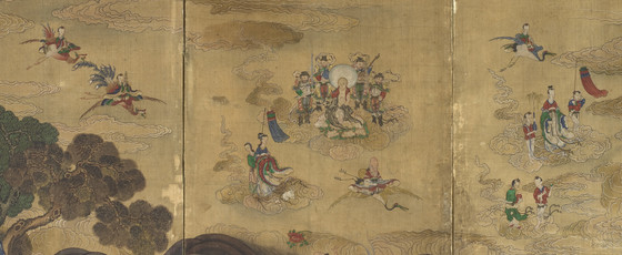 In this painting, Queen Mother Seowangmo and her consort Dongwanggong are enthroned at the center of a garden terrace surrounded by peach trees heavy with fruit overlooking the Jasper Lake (det. 1,2). Beautiful maidens make final preparations for the banquet and musicians accompany a dance performance featuring a pair of phoenixes (det. 3). As the banquet commences, the many illustrious and immortal guests can be seen on the three panels at the far left, descending from the sky on clouds or floating across the water. The great Daoist philosopher Laozi is the first guest to enter the gathering (det. 4). He is riding a water buffalo, and he can be seen at the bottom of the sixth panel from the right. Close behind him, crossing the water, are the Eight Immortals. He Xiangu, with a basket of mushrooms; Li Tieguai, with his crutch; Zhongli Quan, with his robe open; Lü Dongbin, with a sword; Han Xiangzi, with a flute; Zhang Guolao, with his musical instrument; and Lan Caihe and Cao Guojiu.[3] The popular god Shoulao, distinguishable by his protruding head, and a goddess with a rabbit, presumably representing the moon and feminine yin force, can be seen in the clouds directly above (det. 5). Perhaps most interesting, at the top of this group is a monk accompanied by four warriors, apparently a reference to the classic Korean novel A Dream of Nine Clouds by Kim Manjung (1637-1692). In the novel, the monk Shaoyu (literally, “brief sojourner”) “dreams” of being tempted and returning to a mortal life only to “wake up” to find Paradise by realizing that all life is illusion. In this painting, the subject of the banquet of Seowangmo takes on a uniquely Korean form: Not only was the subject modified to fit the screen format so popular in the late Joseon period but the artist depicts non-Chinese characters, including a character from a popular Korean novel.