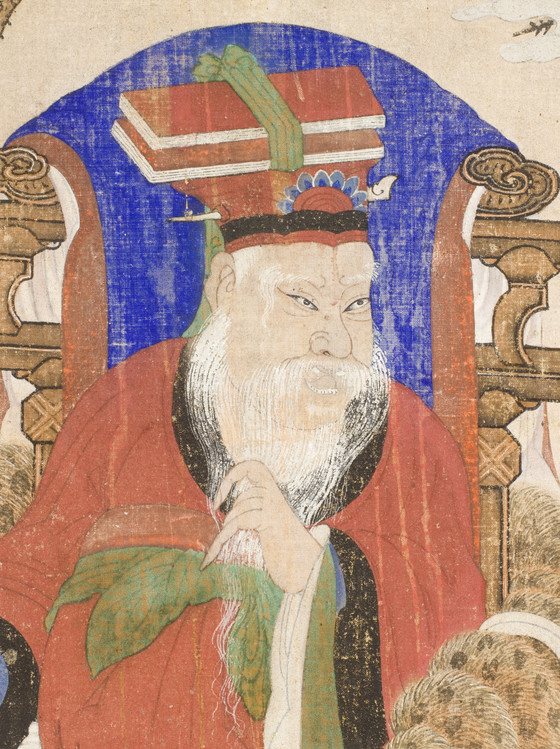 It is not clear why iconography commonly associated with a Judge of the Underworld came to be used in a painting of a mountain god. However, that mountain gods were also regarded as kings is evident from inscriptions on early-nineteenth-century paintings that refer to the subjects as “mountain kings”; this implies a possible reason that a mountain god would be depicted as the Fifth King of Hell.