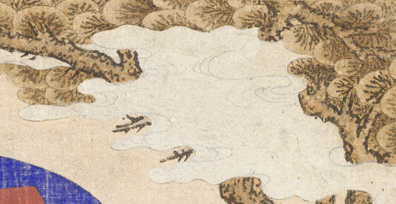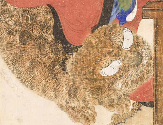 This painting depicts a red-robed mountain god sitting on a wooden chair on a steep mountain slope. He wears a king’s crown mounted with two books (det. 1). He sits with his right foot on his left knee and turns to the left; his mouth is open, as if he is talking to someone, and he strokes his beard with his left hand. A tiger crouches at his feet, looking up (det. 2). The position of the tiger suggests that he ran down the mountain and made a hasty, sharp turn in front of the mountain god; however, the connection between the tiger’s tail and the rest of his body appears unnatural. Behind him on the slope of the mountain is a pine tree with clouds among its branches, and the scene suggests a sublime place where the mountain god resides (det. 3).