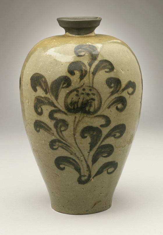 Wheel-thrown stoneware with brown painted decoration and green glaze