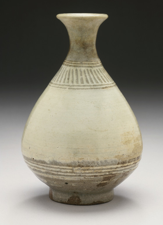 Buncheong ware; Wheel-thrown stoneware with stamped and slip-filled decoration, and pale green glaze