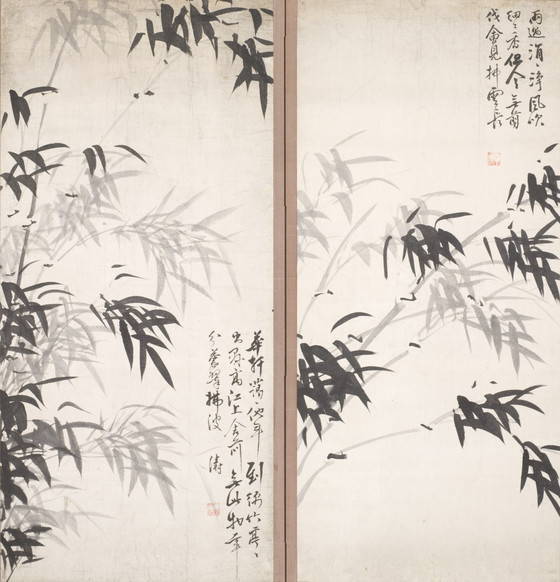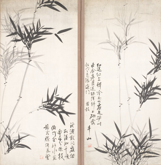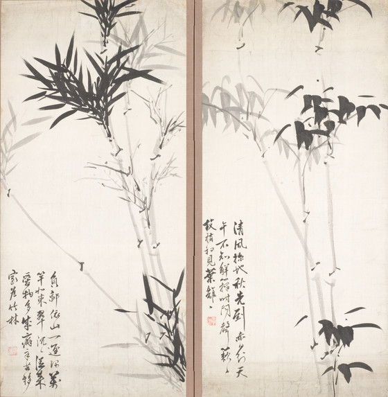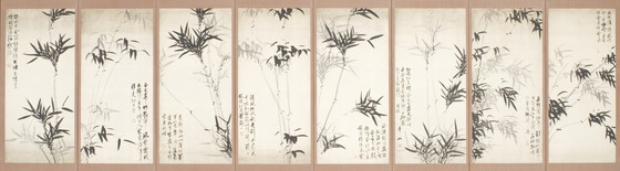 This eight-panel screen beautifully demonstrates the variety of forms that the bamboo plant can take. Each panel contains a five- or seven-character poem praising different aspects of bamboo and its ability to harmonize with nature. Painted in strongly contrasting tones of black ink, the strokes that form the connecting joints of the bamboo are distinctive with their dark tones and sharp angles.