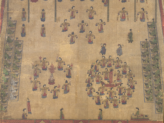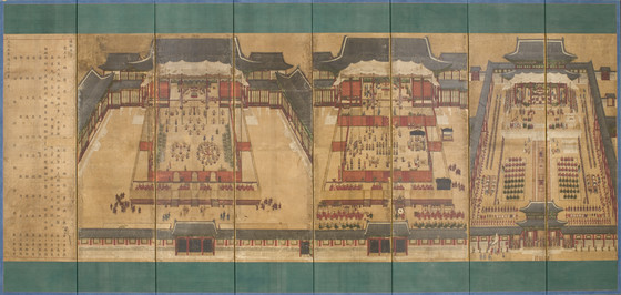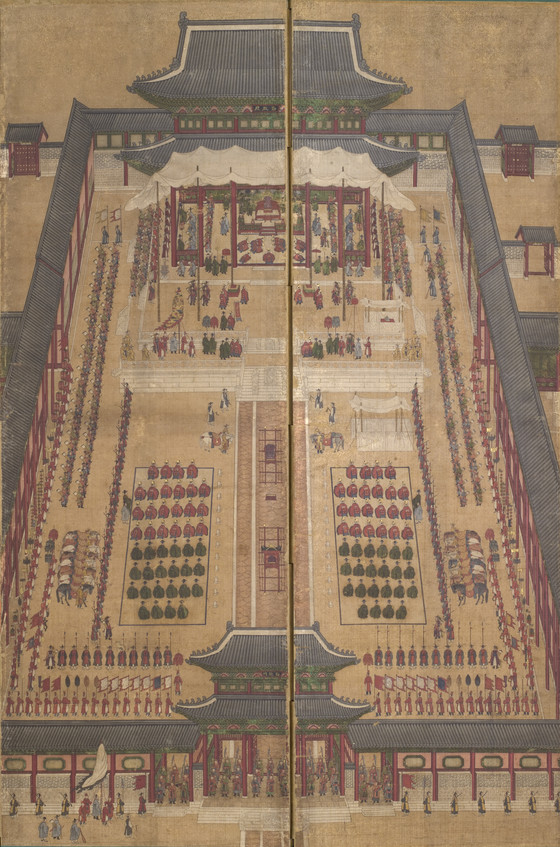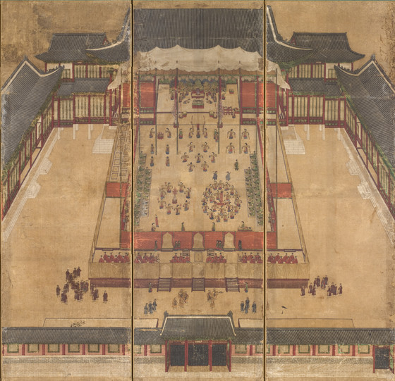 By the end of the eighteenth century, Korean royal banquet paintings had become codified and were mostly executed in a screen format with eight or ten panels. Because of the documentary nature of the screens, the artists faithfully followed the official Ceremonial Regulations (Uigwe), volumes which included woodblock print illustrations indicating exact details of the architecture and the arrangement of the event. Consequently, by the nineteenth century, artists had all but eliminated the landscape scenes of earlier banquet paintings. Painted with great detail, LACMA’s screen is a valuable asset for understanding documentary painting and the political atmosphere of Korea in the early nineteenth century.