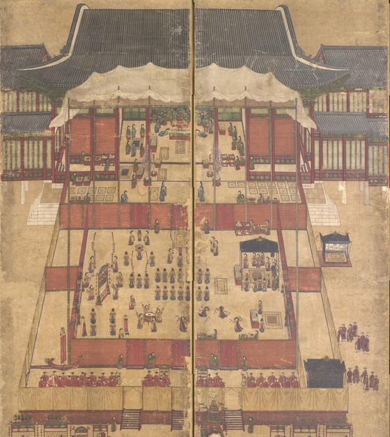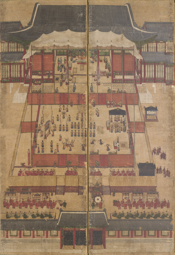 The series of birthday celebrations depicted in Sixtieth Birthday Banquet for Dowager Queen Sinjeong in Gyeongbok Palace took place in 1868, in the early years of Gojong’s rule. The banquet ceremony for the Queen Mother was initiated and strongly supported by the Daewongun as regent. According to the Ceremonial Regulations for a Banquet (Jinchan uigye)[3] – the official record of the schedule of events, locations, and officials in attendance, as well as the proper decoration, costumes, dances, and musical performances – the banquet began on the sixth day of the twelfth month in Geunjeong Hall of Gyeongbok Palace and lasted several days. It was the first major event to take place in the newly reconstructed Gyeongbok Palace, which had been completed one year before under the direction of the Daewongun.