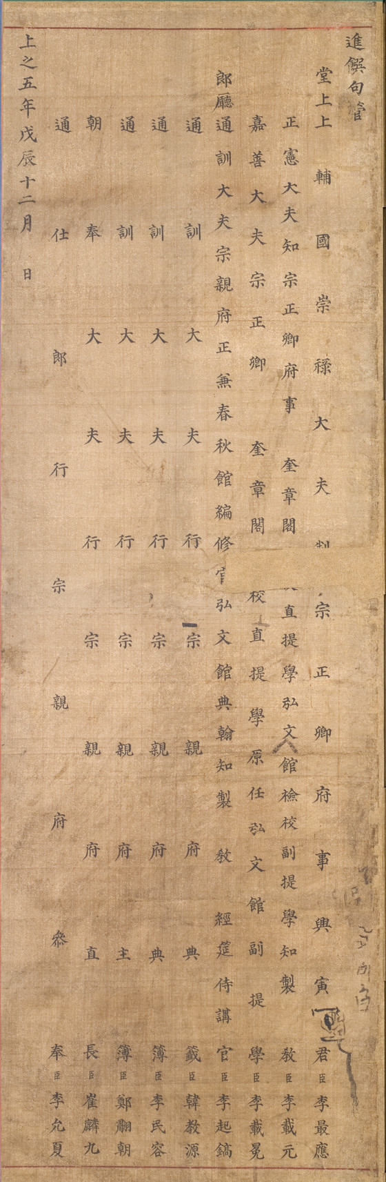 A final panel on the left records the names of the main officials who organized and supervised the celebrations (det. 8). The list of officials, mostly relatives of King Gojong and the Daewongun, includes, for example, Yi Choi’eung (1815-1882), the Daewongun’s elder son; Yi Jaewon (1831-1891), the eldest cousin of King Gojong; and Yi Jaemyon (1845-1912), the Daewongun’s first son and King Gojong’s older brother. According to the Ceremonial Regulations for a Banquet (Jinchan uigye), because the banquet was planned as a private family event rather than as a national public spectacle, the event could be organized by a group chosen by the royal family, rather than by the official event planning bureau.