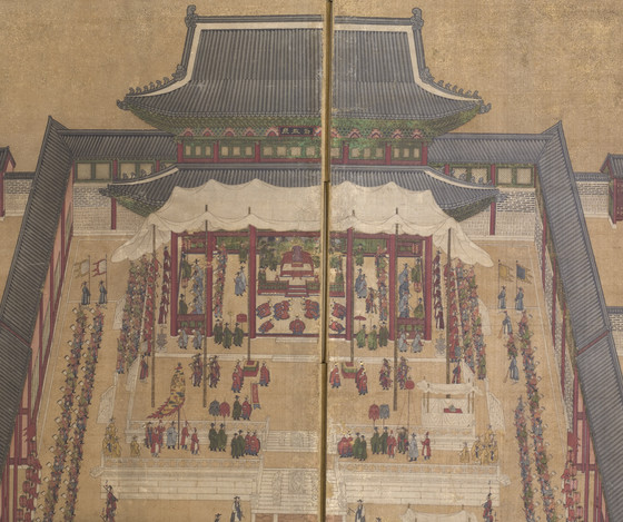 The first scene, on the two right panels, depicts the Great Court Ceremony at the beginning of the celebration, in Throne Hall (Geonjeongjeon) (det. 1). This, the most formal ritual of the event, was staged in the king’s hall with precise and orderly processions of officers and several royal palanquins. In the center of the scene, an official recites Queen Mother Sinjeong’s accomplishments and receives the king’s declaration to commence the celebration (det. 2). Typical of royal documentary painting, the king’s presence is symbolized by the empty throne in front of the Sun, Moon and Five Peaks screen.
