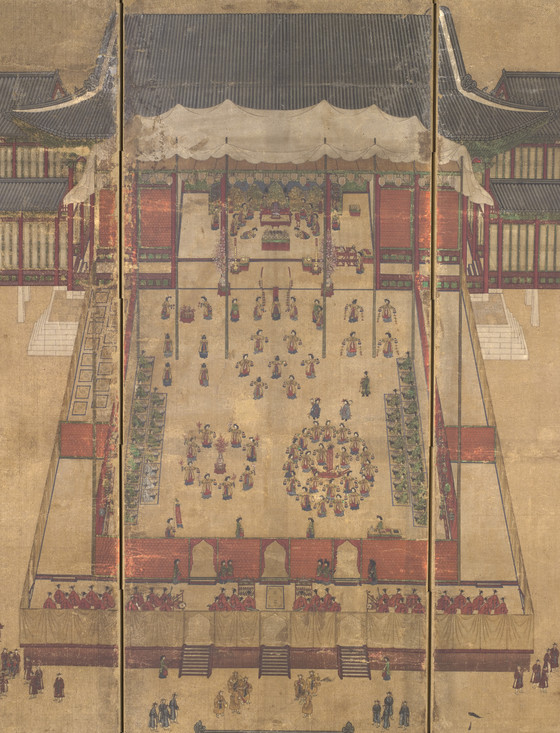 This colorful screen documents the royal banquet ceremonies held in celebration of the sixtieth birthday of Queen Mother Sinjeong (1808-1890).[1] Her life, marked by tragedy at times, was intertwined with the political turmoil and power struggles of the nineteenth-century Korean court. Lady Cho, as she was called before she became a member of the royal family, married a crown prince when she was only eleven years old but, sadly, her young husband died before ascending the throne. The dowager queen outlived her son, King Heonjong (reigned 1834-1849), who also died young. After failing to install a relative on the throne after her son’s death, Queen Mother Sinjeong allied with Yi Ha’eung (1820-1898), who was soon to be Daewongun,[2] and used her influence to name the Daewongun’s second son, from a distant royal family, as the next king. Twelve-year-old King Gojong reigned from 1864 to 1907 and, as his regent, the Daewongun governed the court for the next ten years, at a most crucial moment in Korean history.